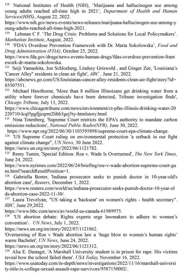 治理缺位危害環(huán)境權(quán)。美國(guó)廣播公司2022年6月21日?qǐng)?bào)道,在路易斯安那州,大量排放的工業(yè)廢料致使密西西比河沿岸出現(xiàn)諸多“癌癥巷”地區(qū),該地區(qū)民眾因空氣污染而患癌的風(fēng)險(xiǎn)較美國(guó)其他地區(qū)高出95%。(注121)《芝加哥論壇報(bào)》2022年7月13日?qǐng)?bào)道,在伊利諾伊州,占當(dāng)?shù)厝丝诩s60%的逾800萬(wàn)居民的飲用水中,檢測(cè)到至少含一種可能有損健康的“永久性化學(xué)物質(zhì)”。(注122)在環(huán)境形勢(shì)日趨惡化的背景下,美國(guó)聯(lián)邦最高法院卻于2022年6月裁定,美國(guó)環(huán)境保護(hù)局無(wú)權(quán)在未得到美國(guó)國(guó)會(huì)授權(quán)的條件下,在州層面限制溫室氣體排放量,也不得要求發(fā)電廠放棄化石燃料轉(zhuǎn)用可再生能源。(注123)聯(lián)合國(guó)秘書長(zhǎng)發(fā)言人杜加里克指出,美國(guó)聯(lián)邦最高法院的這一裁決,是“全球應(yīng)對(duì)氣候變化的一次挫折”。(注124)