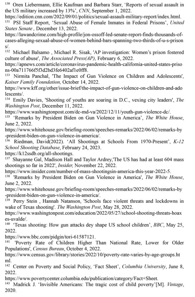 槍禍橫行威脅兒童生命安全。凱澤家庭基金會(huì)2022年10月14日發(fā)表報(bào)告指出,2011年至2021年,美國(guó)近18500名17歲及以下的兒童死于槍支暴力。2021年平均每天有7名兒童死于槍擊。(注133)《華盛頓郵報(bào)》2022年12月11日?qǐng)?bào)道,2022年美國(guó)有超過(guò)5800名18歲以下的兒童因槍擊受傷或死亡。截至2022年12月1日,涉及兒童的致命槍擊事件比2021年增加了一倍多,涉及兒童的非致命槍擊事件也增加了80%以上。(注134)美國(guó)總統(tǒng)拜登2022年6月公開承認(rèn):“槍擊已成為美國(guó)兒童第一大死因,死于槍擊的兒童比死于車禍和癌癥的兒童還要多?!保ㄗ?35)