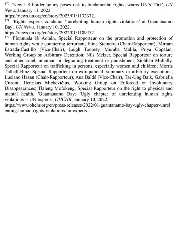 拒不關(guān)閉關(guān)塔那摩監(jiān)獄。2002年設(shè)立的關(guān)塔那摩監(jiān)獄最多時(shí)曾關(guān)押約780人,其中大多數(shù)人未經(jīng)審判便遭拘留,受到了殘忍的、不人道的待遇,是美國(guó)“肆意侵犯人權(quán)的一個(gè)丑陋篇章”。(注171)聯(lián)合國(guó)人權(quán)理事會(huì)在反恐中促進(jìn)和保障人權(quán)問(wèn)題特別報(bào)告員菲奧努阿拉·尼奧萊因等多名獨(dú)立專家2022年1月發(fā)表共同聲明指出,臭名昭著的關(guān)塔那摩監(jiān)獄是美國(guó)在人權(quán)保護(hù)上的污點(diǎn),要求美國(guó)政府關(guān)閉關(guān)塔那摩監(jiān)獄,對(duì)遭受酷刑、任意拘留的公民進(jìn)行賠償,并根據(jù)國(guó)際法追究授權(quán)和實(shí)施酷刑的人員的責(zé)任。(注172)
