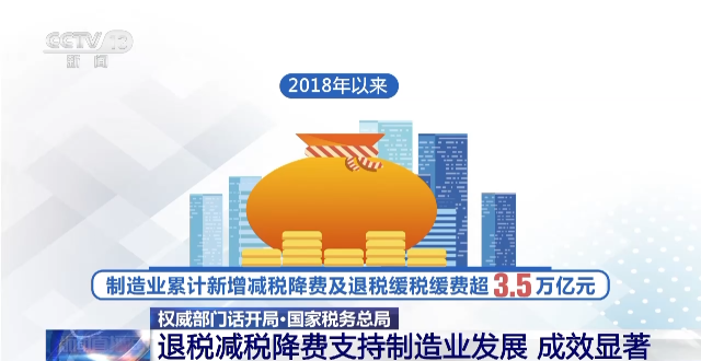 在今天(6日)國(guó)務(wù)院新聞辦公室舉行的“權(quán)威部門(mén)話(huà)開(kāi)局”系列主題新聞發(fā)布會(huì)上,國(guó)家稅務(wù)總局有關(guān)負(fù)責(zé)人表示,近年來(lái),我國(guó)實(shí)施的一系列退稅減稅降費(fèi)舉措,有力支持了制造業(yè)發(fā)展,成效顯著。
