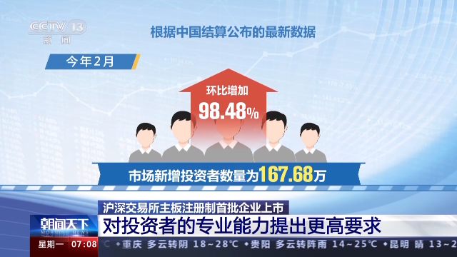 根據(jù)中國結(jié)算公布的最新數(shù)據(jù),今年2月,市場新增投資者數(shù)量為167.68萬,環(huán)比增加98.48%,這是時隔4個月之后,市場單月新增投資者數(shù)量再次超過百萬。截至2月末,我國A股投資者已達(dá)到2.14億。專家表示,全面實(shí)行注冊制,一些市場規(guī)則隨之調(diào)整,投資者需要審慎進(jìn)行判斷。