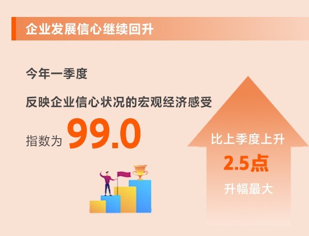 今年以來,我國經(jīng)濟(jì)運(yùn)行持續(xù)回暖,增長動(dòng)能不斷釋放,發(fā)展信心明顯增強(qiáng)。一季度,反映企業(yè)信心狀況的宏觀經(jīng)濟(jì)感受指數(shù)為99.0,比上季度上升2.5點(diǎn),升幅最大。從宏觀經(jīng)濟(jì)感受指數(shù)的細(xì)項(xiàng)看,宏觀感受指數(shù)為103.6,比上季度上升2.4點(diǎn),高于景氣臨界值100;行業(yè)運(yùn)行指數(shù)為94.3,比上季度上升2.6點(diǎn),升幅較大。