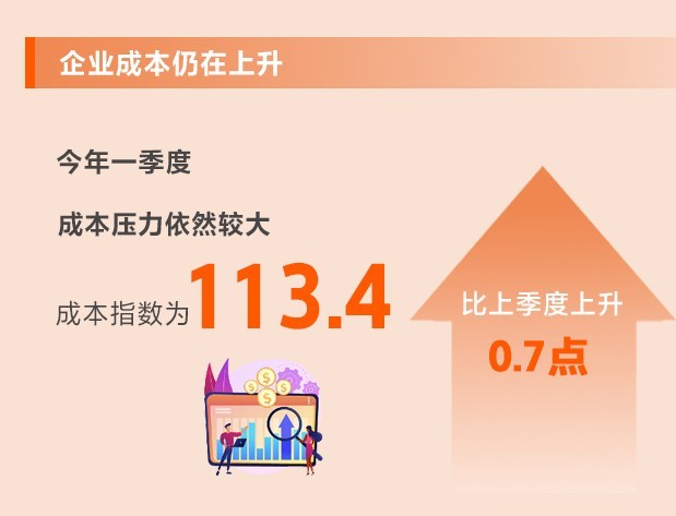 全球通脹仍處于高位,美聯(lián)儲(chǔ)急速加息對世界經(jīng)濟(jì)影響的外溢效應(yīng)持續(xù)顯現(xiàn)。中小企業(yè)多位于產(chǎn)業(yè)鏈下游且面對消費(fèi)者,需求疲弱情況下難以轉(zhuǎn)嫁上游原材料價(jià)格上漲的壓力,同時(shí)還面臨人力成本上行以及房屋租金較高等困難。一季度,成本指數(shù)為113.4,比上季度上升0.7點(diǎn),仍處于不景氣區(qū)間,說明成本壓力依然較大。所調(diào)查的8個(gè)行業(yè)中,7個(gè)行業(yè)生產(chǎn)成本指數(shù)、8個(gè)行業(yè)勞動(dòng)力成本指數(shù)均上升。