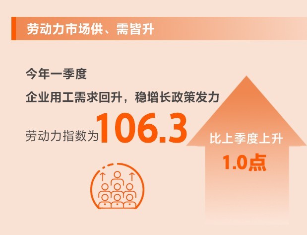 隨著生產(chǎn)生活秩序的恢復(fù),人員流動(dòng)性的提高,企業(yè)用工需求開始回升,同時(shí)穩(wěn)增長政策持續(xù)發(fā)力,從業(yè)人數(shù)有所上升。一季度,勞動(dòng)力指數(shù)為106.3,比上季度上升1.0點(diǎn)。其中,供應(yīng)指數(shù)為113.6,比上季度上升0.1點(diǎn);需求指數(shù)為98.9,比上季度上升1.9點(diǎn)。