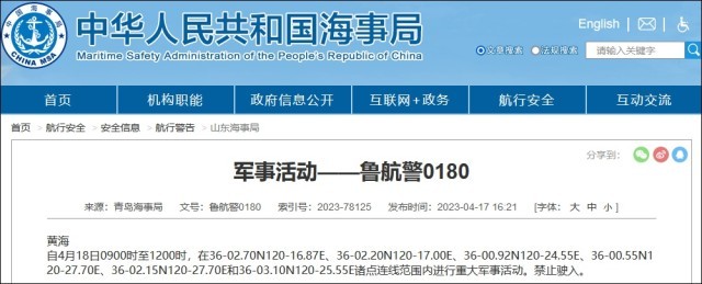 據(jù)中國海事局網(wǎng)站消息,青島海事局發(fā)布航行警告,4月18日9時至12時,黃海部分海域進行重大軍事活動,禁止駛入。