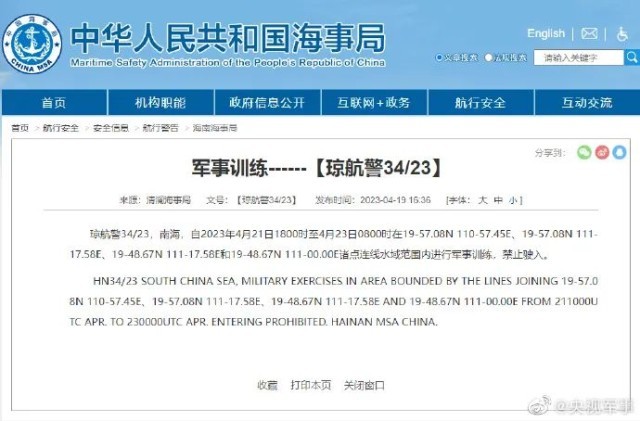 據(jù)中國海事局網(wǎng)站消息,清瀾海事局發(fā)布航行警告,自4月21日18時至4月23日8時,南海部分海域進行軍事訓練,禁止駛入。