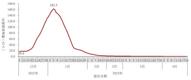 (一)在院新冠病毒感染者結(jié)果。全國(guó)在院新冠病毒感染者于2023年1月5日達(dá)到峰值162.5萬(wàn)人,隨后持續(xù)下降;4月20日下降至3929例,較峰值減少了99.8%(圖3-1)。