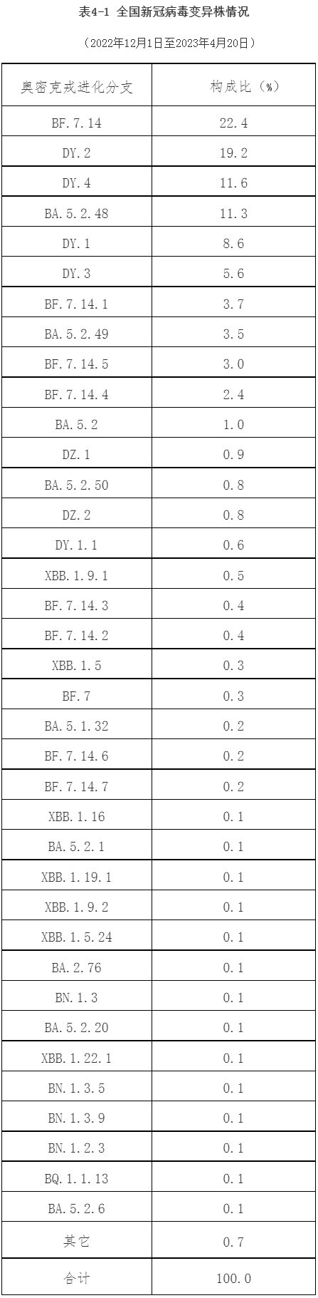 ?。ǘ?2月以來本土病例病毒變異株監(jiān)測(cè)情況。2022年12月1日至2023年4月20日,全國(guó)共報(bào)送32993例本土病例新冠病毒基因組有效序列,均為奧密克戎變異株,涵蓋117個(gè)進(jìn)化分支。主要流行株為BA.5.2及其亞分支(構(gòu)成比64.3%)和BF.7及其亞分支(構(gòu)成比33.0%)等。其中,BA.5.2及其亞分支包括DY.2(19.2%)、DY.4(11.6%)、BA.5.2.48(11.3%)、DY.1(8.6%)、DY.3(5.6%)和BA.5.2.49(3.5%)等;BF.7及其亞分支包括BF.7.14(22.4%)、BF.7.14.1(3.7%)、BF.7.14.5(3.0%)、BF.7.14.4(2.4%)、BF.7.14.3(0.4%)和BF.7.14.2(0.3%)等(表4-1)。共監(jiān)測(cè)到本土重點(diǎn)關(guān)注變異株603例,其中,4例BQ.1、4例BQ.1.1、19例BQ.1.1.13、1例BQ.1.1.17、1例BQ.1.1.18、1例BQ.1.1.35、1例BQ.1.1.38、1例BQ.1.1.46、1例BQ.1.1.53、2例BQ.1.1.66、1例BQ.1.1.69、8例BQ.1.2、1例BQ.1.23、2例BQ.1.8、2例CH.1.1、3例CH.1.1.1、1例CH.1.1.11、1例DT.2、1例EA.1、2例EG.1、3例EL.1、7例EM.1、1例EU.1.1、2例FB.1、3例FE.1、1例XBB、4例XBB.1、2例XBB.1.11.1、1例XBB.1.12、4例XBB.1.15、42例XBB.1.16、5例XBB.1.16.1、16例XBB.1.17.1、37例XBB.1.19.1、2例XBB.1.22、22例XBB.1.22.1、1例XBB.1.23、5例XBB.1.24、1例XBB.1.4、109例XBB.1.5、2例XBB.1.5.11、9例XBB.1.5.12、2例XBB.1.5.15、7例XBB.1.5.23、35例XBB.1.5.24、1例XBB.1.5.28、1例XBB.1.5.32、1例XBB.1.5.36、1例XBB.1.5.5、2例XBB.1.5.7、2例XBB.1.9、163例XBB.1.9.1、35例XBB.1.9.2、1例XBB.1.9.3、1例XBB.1.9.5、11例XBB.2.3、1例XBB.2.3.2、1例XBB.2.4和2例XBB.3。