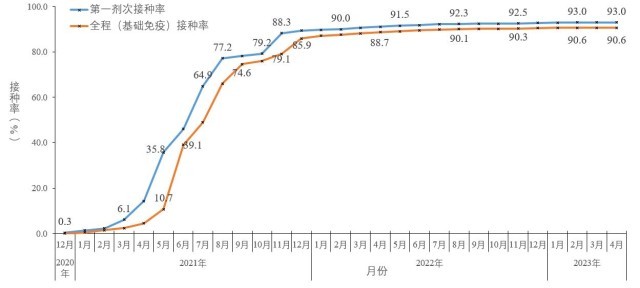 截至2023年4月20日,31個(gè)省(自治區(qū)、直轄市)和新疆生產(chǎn)建設(shè)兵團(tuán)累計(jì)報(bào)告接種新冠病毒疫苗349443.2萬(wàn)劑次(圖5-1)。接種總?cè)藬?shù)131048.0萬(wàn)人,完成全程接種127708.4萬(wàn)人,完成第一劑次加強(qiáng)免疫接種82783.9萬(wàn)人。全人群第一劑次、全程接種覆蓋比例分別達(dá)到93.0%和90.6%(圖5-2)。60歲以上老年人累計(jì)報(bào)告接種新冠病毒疫苗68083.7萬(wàn)劑次,接種總?cè)藬?shù)24169.3萬(wàn)人,完成全程接種23036.1萬(wàn)人,完成第一劑次加強(qiáng)免疫接種19318.9萬(wàn)人。