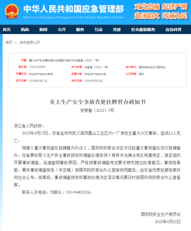 國務(wù)院安委會近日發(fā)布通知書,決定對浙江金華一廠房重大火災(zāi)事故查處實行掛牌督辦。具體通知如下: