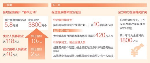 保重點,促進重點群體就業(yè)創(chuàng)業(yè)。針對高校畢業(yè)生,將實施促進高校畢業(yè)生等青年就業(yè)創(chuàng)業(yè)推進計劃,開展10項具體行動,著力拓展就業(yè)渠道、做實做細就業(yè)服務、強化困難兜底保障。截至4月中旬,大中城市聯合招聘春季專場提供崗位420萬人次。針對農民工、就業(yè)困難人員,將組建勞務協(xié)作聯盟,健全跨區(qū)域信息共享和勞務輸出機制。加強困難群體就業(yè)兜底幫扶,確保零就業(yè)家庭至少有一人就業(yè)。