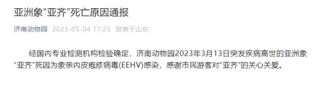 央視網(wǎng)消息:5月4日,濟(jì)南動(dòng)物園公眾號(hào)通報(bào)亞洲象“亞齊”死亡原因。 經(jīng)國(guó)內(nèi)專業(yè)檢測(cè)機(jī)構(gòu)檢驗(yàn)確定,濟(jì)南動(dòng)物園2023年3月13日突發(fā)疾病離世的亞洲象“亞齊”死因?yàn)橄笥H內(nèi)皮皰疹病毒(EEHV)感染,感謝市民游客對(duì)“亞齊”的關(guān)心關(guān)愛(ài)。