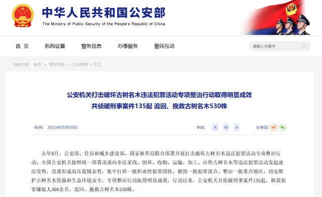 公安機(jī)關(guān)打擊破壞古樹(shù)名木違法犯罪活動(dòng)專項(xiàng)整治行動(dòng)取得明顯成效 追回、挽救古樹(shù)名木530株