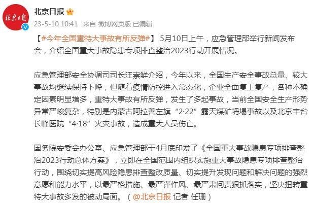 應急管理部安全協(xié)調(diào)司司長汪崇鮮介紹,今年以來,全國生產(chǎn)安全事故總量、較大事故均繼續(xù)保持下降,但隨著疫情防控進入常態(tài)化,企業(yè)全面復工復產(chǎn),各種不確定因素明顯增多,重特大事故有所反彈,發(fā)生了多起事故,當前全國安全生產(chǎn)形勢異常嚴峻復雜,特別是內(nèi)蒙古阿拉善左旗“2·22”露天煤礦坍塌事故以及北京豐臺長峰醫(yī)院“4·18”火災事故,造成重大人員傷亡。