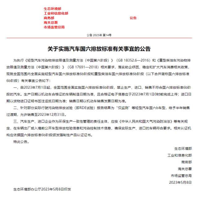 生態(tài)環(huán)境部辦公廳2023年5月8日印發(fā)關(guān)于實(shí)施汽車國六排放標(biāo)準(zhǔn)有關(guān)事宜的公告: