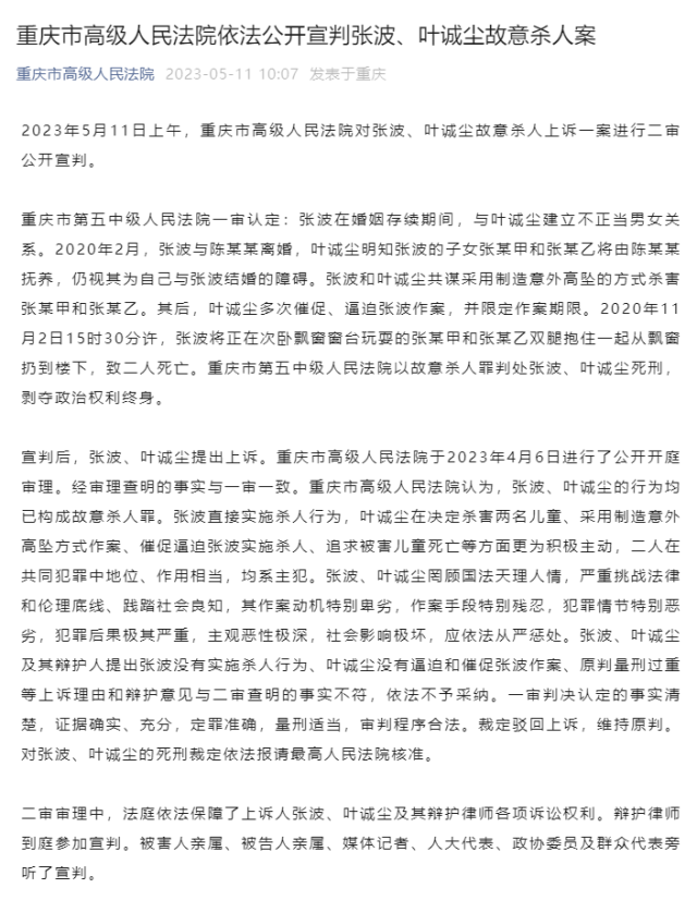 宣判后,張波、葉誠(chéng)塵提出上訴。重慶市高級(jí)人民法院于2023年4月6日進(jìn)行了公開(kāi)開(kāi)庭審理。經(jīng)審理查明的事實(shí)與一審一致。重慶市高級(jí)人民法院認(rèn)為,張波、葉誠(chéng)塵的行為均已構(gòu)成故意殺人罪。張波直接實(shí)施殺人行為,葉誠(chéng)塵在決定殺害兩名兒童、采用制造意外高墜方式作案、催促逼迫張波實(shí)施殺人、追求被害兒童死亡等方面更為積極主動(dòng),二人在共同犯罪中地位、作用相當(dāng),均系主犯。張波、葉誠(chéng)塵罔顧國(guó)法天理人情,嚴(yán)重挑戰(zhàn)法律和倫理底線、踐踏社會(huì)良知,其作案動(dòng)機(jī)特別卑劣,作案手段特別殘忍,犯罪情節(jié)特別惡劣,犯罪后果極其嚴(yán)重,主觀惡性極深,社會(huì)影響極壞,應(yīng)依法從嚴(yán)懲處。張波、葉誠(chéng)塵及其辯護(hù)人提出張波沒(méi)有實(shí)施殺人行為、葉誠(chéng)塵沒(méi)有逼迫和催促?gòu)埐ㄗ靼?、原判量刑過(guò)重等上訴理由和辯護(hù)意見(jiàn)與二審查明的事實(shí)不符,依法不予采納。一審判決認(rèn)定的事實(shí)清楚,證據(jù)確實(shí)、充分,定罪準(zhǔn)確,量刑適當(dāng),審判程序合法。裁定駁回上訴,維持原判。對(duì)張波、葉誠(chéng)塵的死刑裁定依法報(bào)請(qǐng)最高人民法院核準(zhǔn)。