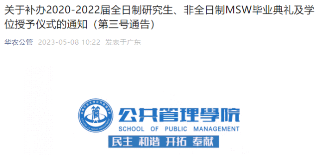 5月8日,華南農業(yè)大學公共管理學院發(fā)布通知,決定為2020-2022屆全日制研究生、非全日制MSW補辦畢業(yè)典禮及學位授予儀式,畢業(yè)典禮及學位授予儀式以預約方式報名參加,時間定于5月20日(周六)。