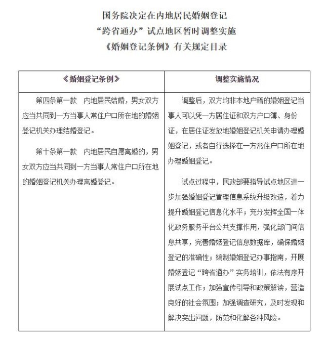 在試點(diǎn)地區(qū),相應(yīng)暫時(shí)調(diào)整實(shí)施《婚姻登記條例》第四條第一款、第十條第一款的有關(guān)規(guī)定(目錄附后)。調(diào)整后,雙方均非本地戶(hù)籍的婚姻登記當(dāng)事人可以憑一方居住證和雙方戶(hù)口簿、身份證,在居住證發(fā)放地婚姻登記機(jī)關(guān)申請(qǐng)辦理婚姻登記,或者自行選擇在一方常住戶(hù)口所在地辦理婚姻登記。