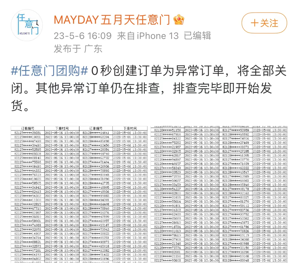 5月6日晚,五月天粉絲團(tuán)票的最后一日,“MAYDAY五月天任意門”粉絲站在社交媒體公布大量0秒異常訂單,并表示異常訂單將全部關(guān)閉,排查完畢后即開始發(fā)貨。然而不足3個(gè)小時(shí),一則團(tuán)票取消的通知讓粉絲們剛剛搶到票的喜悅消失殆盡。