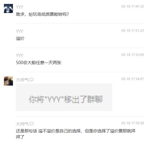 下一秒,群主現(xiàn)身并放出一張截圖,上面顯示求票的粉絲已被移除群聊。隨后群主寫道:“還是那句話,溢不溢價(jià)是自己的選擇,但是你選擇了溢價(jià)票那就拜拜了。”