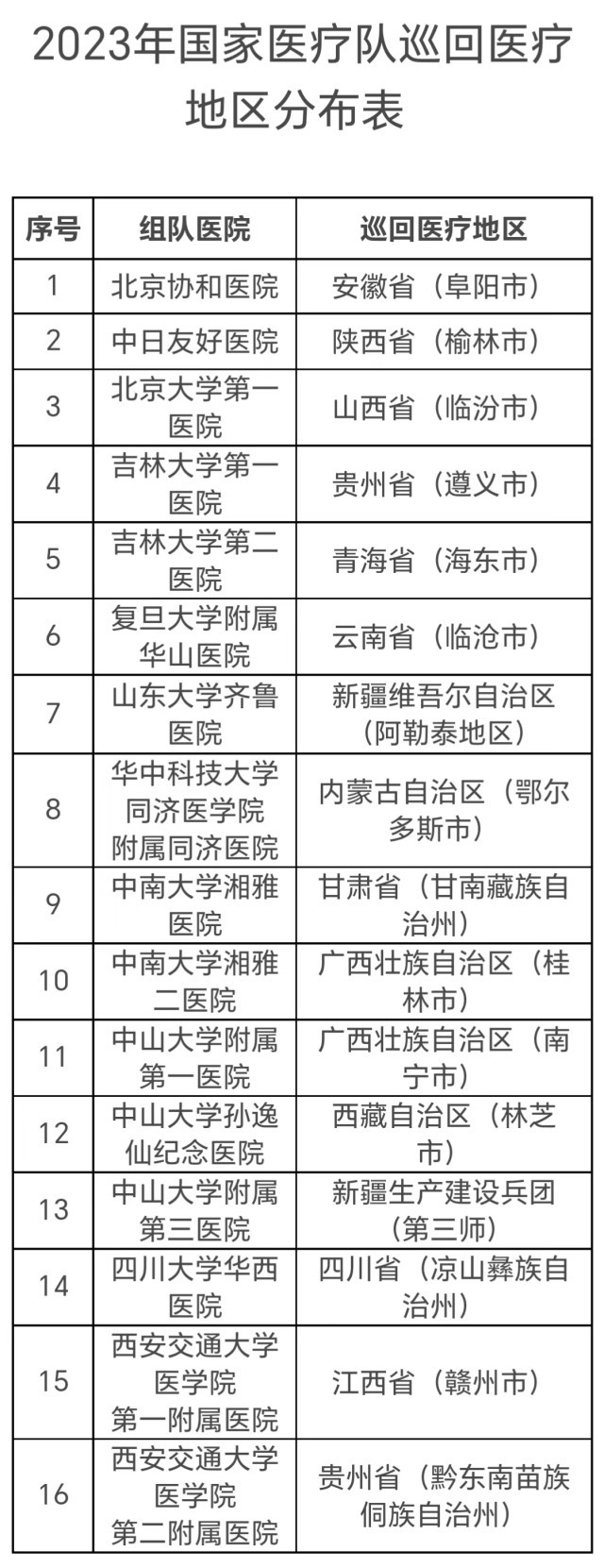 國家醫(yī)療隊(duì)的組隊(duì)醫(yī)院包括北京協(xié)和醫(yī)院、中日友好醫(yī)院等16家,分赴安徽、陜西等地,派出時(shí)間為6—10月。每支國家醫(yī)療隊(duì)不少于5人,以副高及以上職稱的醫(yī)務(wù)人員為主,重點(diǎn)開展巡回醫(yī)療、技術(shù)和管理指導(dǎo)、人員培訓(xùn)、加強(qiáng)遠(yuǎn)程醫(yī)療協(xié)作網(wǎng)建設(shè)等工作。工作時(shí)間不少于3周,其中在縣域開展工作的時(shí)間不少于兩周。