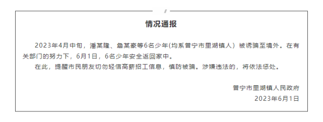 央視網(wǎng)消息:據(jù)“普寧發(fā)布”微信公眾號消息,普寧市里湖鎮(zhèn)人民政府情況發(fā)布通報稱,2023年4月中旬,潘某隆、詹某豪等6名少年(均系普寧市里湖鎮(zhèn)人)被誘騙至境外。在有關(guān)部門的努力下,6月1日,6名少年安全返回家中。
