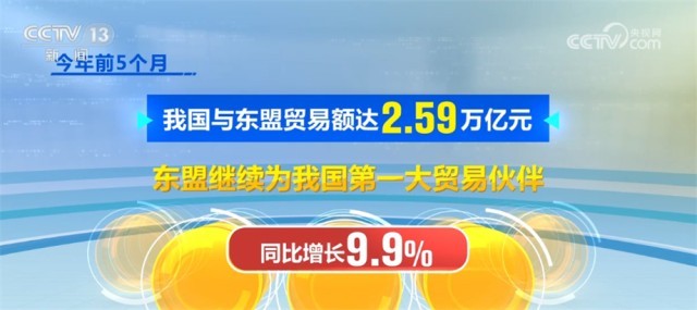 今年前5個(gè)月,我國(guó)與東盟貿(mào)易額達(dá)2.59萬(wàn)億元,東盟繼續(xù)為我國(guó)第一大貿(mào)易伙伴,同比增長(zhǎng)9.9%。