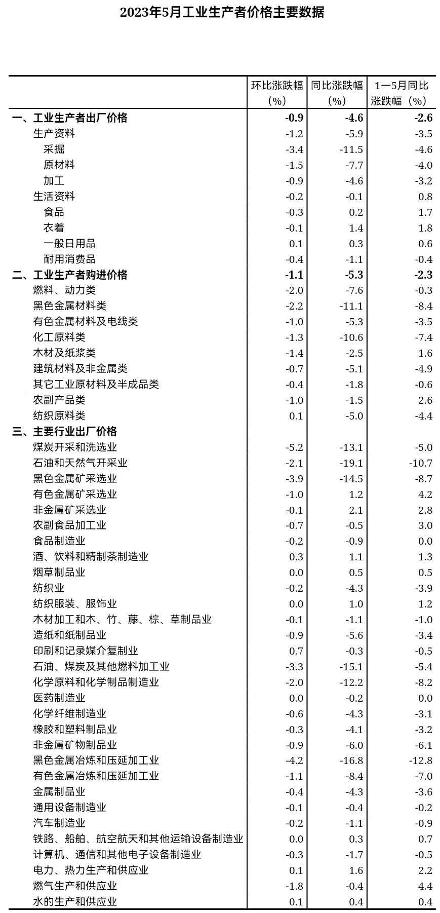 6月15日,國(guó)家統(tǒng)計(jì)局發(fā)布消息,2023年5月份,全國(guó)工業(yè)生產(chǎn)者出廠價(jià)格同比下降4.6%,環(huán)比下降0.9%;工業(yè)生產(chǎn)者購進(jìn)價(jià)格同比下降5.3%,環(huán)比下降1.1%。1—5月平均,工業(yè)生產(chǎn)者出廠價(jià)格比去年同期下降2.6%,工業(yè)生產(chǎn)者購進(jìn)價(jià)格下降2.3%。