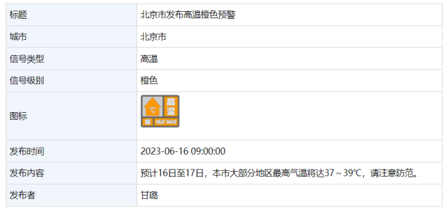 北京市氣象臺今天(16日)9時升級發(fā)布高溫橙色預(yù)警信號:預(yù)計16日至17日,北京市大部分地區(qū)最高氣溫將達37~39℃,請注意防范。