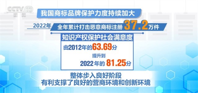 央視網(wǎng)消息:第十三屆中國(guó)國(guó)際商標(biāo)品牌節(jié)昨天(6月17日)在東莞開幕,國(guó)家知識(shí)產(chǎn)權(quán)局相關(guān)負(fù)責(zé)人介紹,我國(guó)商標(biāo)品牌保護(hù)力度持續(xù)加大,2022年全年累計(jì)打擊惡意商標(biāo)注冊(cè)37.2萬(wàn)件,知識(shí)產(chǎn)權(quán)保護(hù)社會(huì)滿意度由2012年的63.69分提升到去年的81.25分,整體步入良好階段,有利支撐了良好的營(yíng)商環(huán)境和創(chuàng)新環(huán)境。