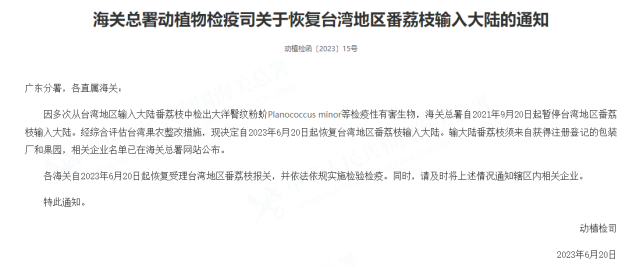 各海關(guān)自2023年6月20日起恢復(fù)受理臺(tái)灣地區(qū)番荔枝報(bào)關(guān),并依法依規(guī)實(shí)施檢驗(yàn)檢疫。同時(shí),請(qǐng)及時(shí)將上述情況通知轄區(qū)內(nèi)相關(guān)企業(yè)。