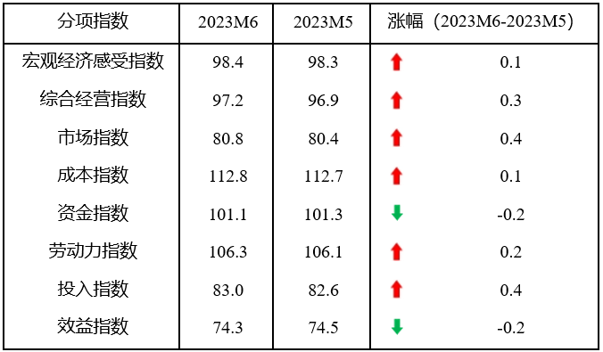 從分項(xiàng)指數(shù)看,6月份,8個(gè)分項(xiàng)指數(shù)6升2降,宏觀經(jīng)濟(jì)感受指數(shù)、市場指數(shù)、成本指數(shù)和投入指數(shù)止跌回升,綜合經(jīng)營指數(shù)由平轉(zhuǎn)升,勞動(dòng)力指數(shù)連續(xù)兩個(gè)月上升,資金指數(shù)和效益指數(shù)由升或平轉(zhuǎn)降。