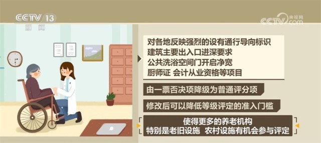 此次發(fā)布的指南包括環(huán)境、設(shè)施設(shè)備、運(yùn)營管理、服務(wù)等多項(xiàng)內(nèi)容,與2020年發(fā)布的《<養(yǎng)老機(jī)構(gòu)等級劃分與評定>國家標(biāo)準(zhǔn)實(shí)施指南》(試行)相比,在框架、體例整體保持一致的前提下,刪除了一些可操作性不強(qiáng)以及非養(yǎng)老機(jī)構(gòu)必備的條件,對各地反映強(qiáng)烈的設(shè)有通行導(dǎo)向標(biāo)識、建筑主要出入口進(jìn)深要求、公共洗浴空間門開啟凈寬、廚師證、會計從業(yè)資格等項(xiàng)目,由一票否決項(xiàng)降級為普通評分項(xiàng),修改后可以降低等級評定的準(zhǔn)入門檻,使得更多的養(yǎng)老機(jī)構(gòu)特別是老舊設(shè)施、農(nóng)村設(shè)施有機(jī)會參與評定。