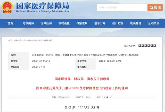 國家醫(yī)保局、財政部、國家衛(wèi)生健康委、國家中醫(yī)藥局14日聯(lián)合印發(fā)《關(guān)于開展2023年醫(yī)療保障基金飛行檢查工作的通知》,將在全國范圍內(nèi)組織開展2023年醫(yī)保基金飛行檢查。