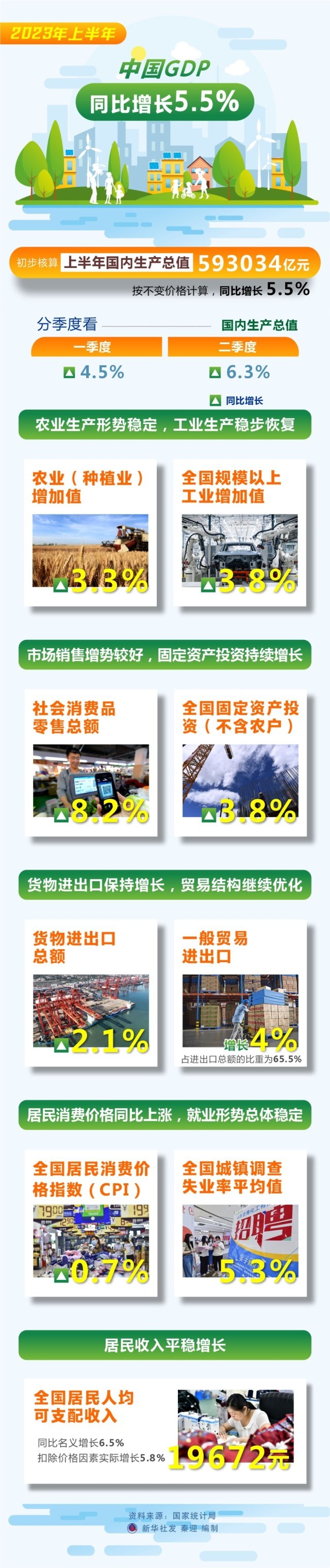翻開半年報,國內(nèi)生產(chǎn)總值比去年同期增長5.5%,社會消費品零售總額同比增長8.2%,第三產(chǎn)業(yè)增加值同比增長6.4%……多項指標顯示,我國經(jīng)濟運行延續(xù)恢復向好態(tài)勢,同時物價、出口等部分指標增速放緩也引發(fā)關(guān)注。