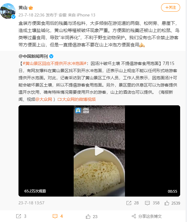 為何不提倡沖方便面?黃山景區(qū):殘羹破壞土壤,不利動物保護