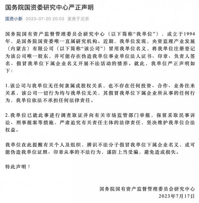 國(guó)務(wù)院國(guó)資委研究中心:一公司冒用我單位名義或開展不法活動(dòng),已調(diào)查取證并舉報(bào)