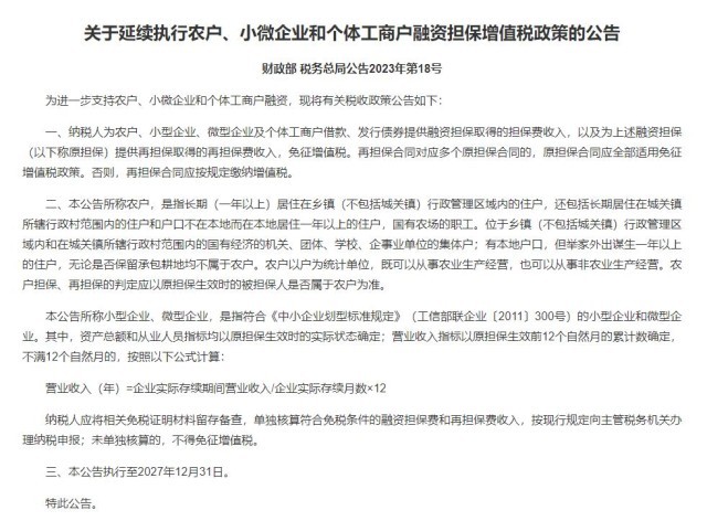 兩部門:延續(xù)執(zhí)行農戶、小微企業(yè)和個體工商戶融資擔保增值稅政策