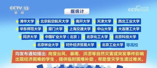 據統(tǒng)計,清華大學、北京航空航天大學、南開大學、天津大學、西北工業(yè)大學、華東師范大學、廈門大學、上海交通大學、中山大學、大連理工大學、同濟大學、中國礦業(yè)大學(北京)、北京化工大學、北京科技大學、北京林業(yè)大學、對外經濟貿易大學、北京工業(yè)大學等高校均發(fā)布通知提出,向受臺風、暴雨、洪澇等自然災害或突發(fā)事件影響出現(xiàn)經濟困難的學生,提供臨時困難補助,幫助受災學生渡過難關。
