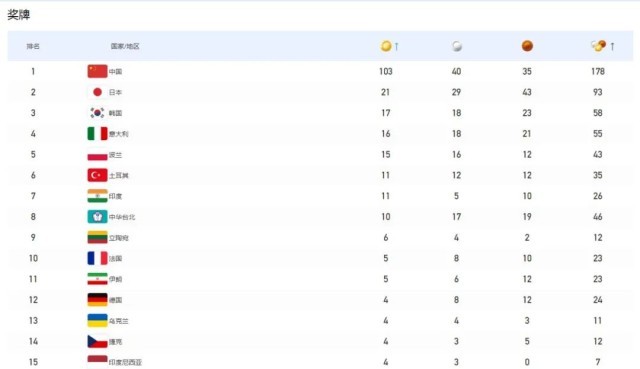 最終,中國代表團(tuán)以103枚金牌、40枚銀牌、35枚銅牌,總計178枚獎牌的成績,位列金牌榜和獎牌榜雙第一。