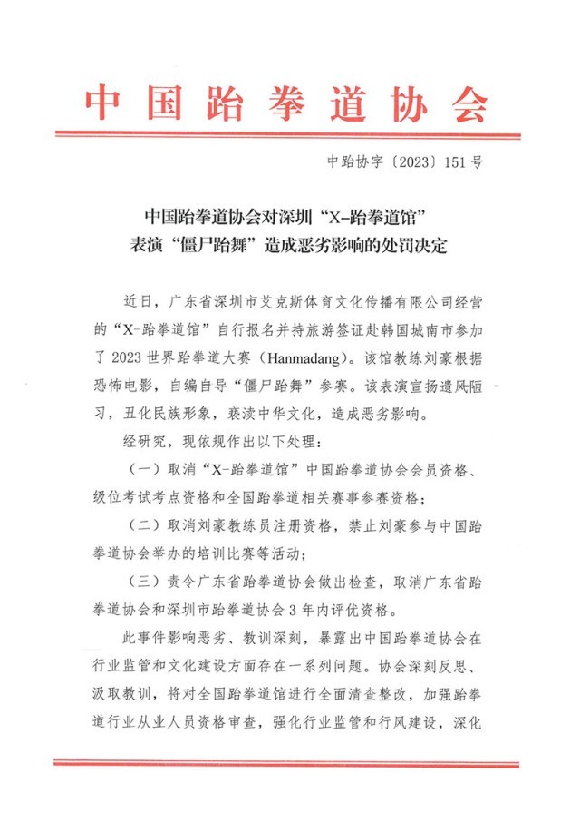 央視網(wǎng)消息:8月21日,中國跆拳道協(xié)會(huì)官網(wǎng)發(fā)布對深圳“X-跆拳道館”表演“僵尸跆舞”造成惡劣影響的處罰決定。