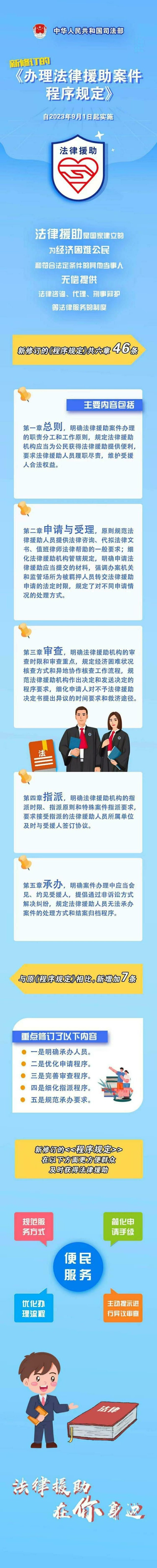為貫徹落實法律援助法,提高法律援助案件辦理程序的標準化規(guī)范化水平,司法部對2012年公布并施行的《辦理法律援助案件程序規(guī)定》進行了全面修訂,修訂后的《程序規(guī)定》,在方便群眾及時獲得法律援助、提高法律援助服務質量等方面,作出了一系列具體規(guī)定。《程序規(guī)定》自2023年9月1日起施行。
