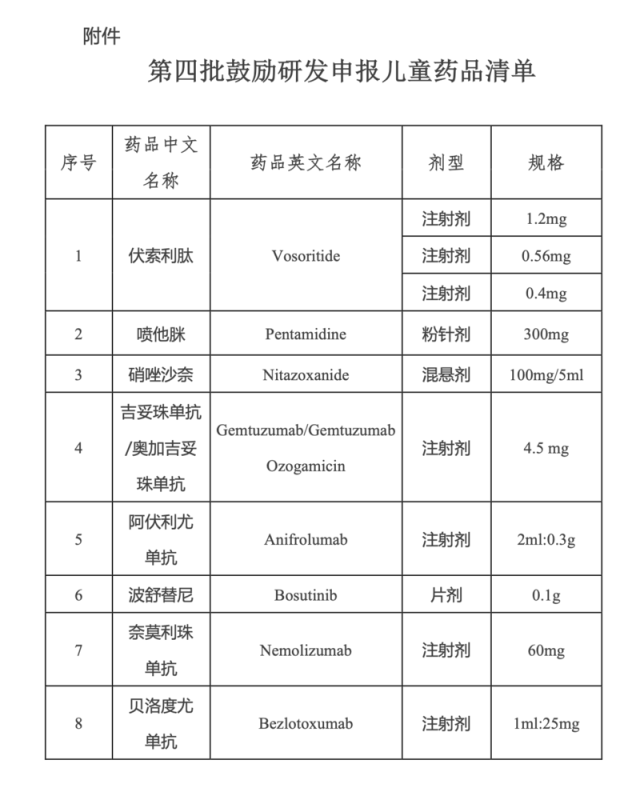 國家衛(wèi)健委發(fā)布的相關(guān)政策解讀中指出,《第四批清單》中的藥品在遴選時,跟進(jìn)全球最新臨床進(jìn)展,將近年來國外已上市國內(nèi)未上市的兒童藥品和國內(nèi)已上市但無兒童適宜劑型規(guī)格藥品作為重點考慮,著重選擇安全性、有效性、適宜性高的品種。例如治療白血病的吉妥珠單抗、波舒替尼等藥品。