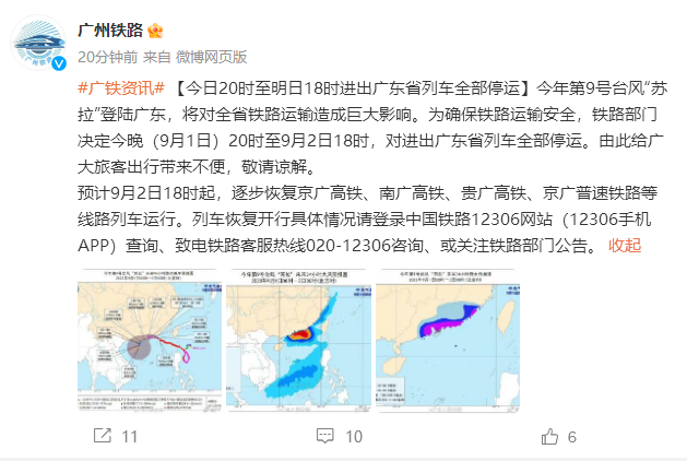 9月1日20時(shí)至9月2日18時(shí),進(jìn)出廣東省列車全部停運(yùn)