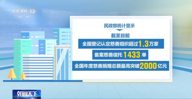 民政部統(tǒng)計顯示,截至目前,全國登記認定慈善組織超過1.3萬家;備案慈善信托1433單;全國年度慈善捐贈總額最高突破2000億元。