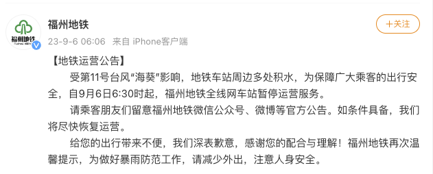 央視網(wǎng)消息:據(jù)@福州地鐵 微博消息,受第11號(hào)臺(tái)風(fēng)“海葵”影響,地鐵車站周邊多處積水,為保障廣大乘客的出行安全,自9月6日6:30時(shí)起,福州地鐵全線網(wǎng)車站暫停運(yùn)營(yíng)服務(wù)。如條件具備,將盡快恢復(fù)運(yùn)營(yíng)。