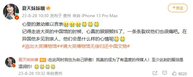 預(yù)告片發(fā)布后,up主“夏天妹妹噢”難掩激動(dòng)之情,她清楚地記得自己走進(jìn)大英博物館的中國(guó)館時(shí),心真的狠狠顫抖了?!耙粭l條裂紋他們也很痛吧,在異國(guó)他鄉(xiāng)見(jiàn)到親人,他們會(huì)是什么樣的心情呢?”同時(shí),她也為自己真正成為了有溫度的傳媒人而驕傲。