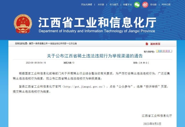 中新網(wǎng)9月6日電 據(jù)江西省工業(yè)和信息化廳官網(wǎng)6日消息,根據(jù)國(guó)家工業(yè)和信息化部等部門關(guān)于開展稀土行業(yè)綜合整治的有關(guān)要求,為嚴(yán)厲打擊稀土違法違規(guī)行為,廣泛征集稀土違法違規(guī)行為線索,現(xiàn)公布江西省稀土違法違規(guī)行為舉報(bào)渠道:登錄江西省工業(yè)和信息化廳官網(wǎng),點(diǎn)擊“公眾參與”,選擇“投訴舉報(bào)”頁(yè)面,提交稀土違法違規(guī)行為線索。
