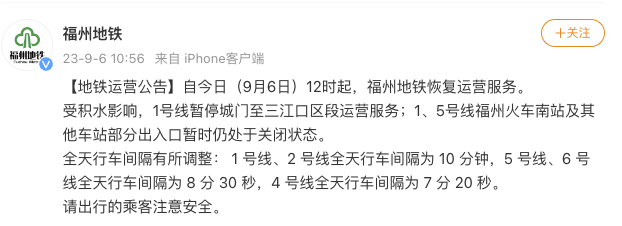 福州地鐵9月6日12時起恢復(fù)運營服務(wù)