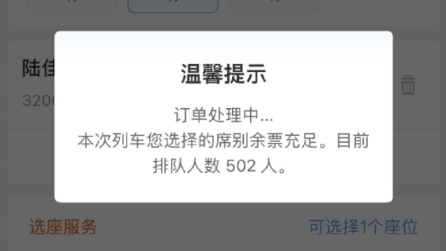 櫻桃脂仔:我的后臺是有乘車人信息的。結果顯示系統(tǒng)繁忙,刷新了3次,才刷出來,然后票也沒了,就幾秒的時間,我一早上就開始盯著了,其他的甚至還有20張票的,我點進去都說沒了?
